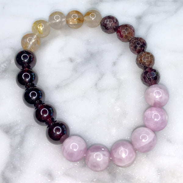✨ Gemstone Bracelet handcrafted with Garnet, Kunzite, and Golden Rutilated Quartz — crystals that ignite passion, open the heart, and channel divine light to help you embody unconditional love.