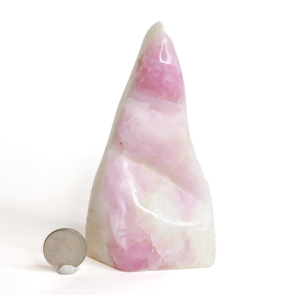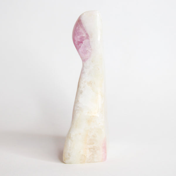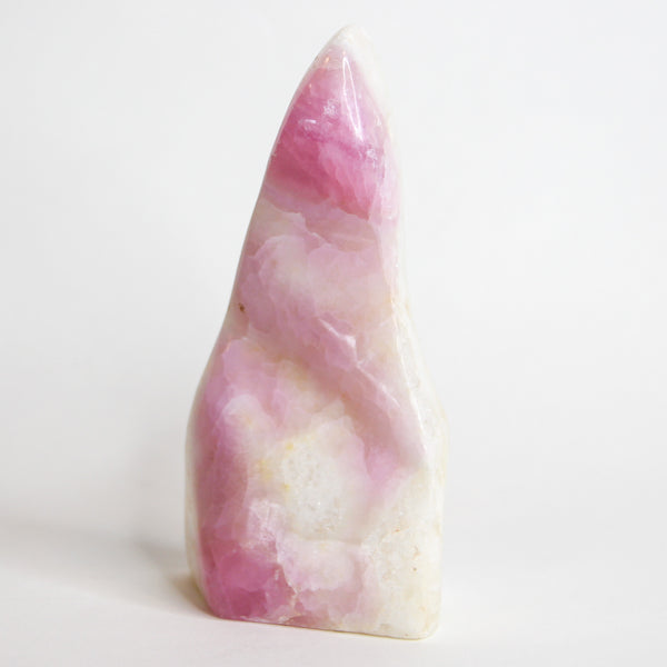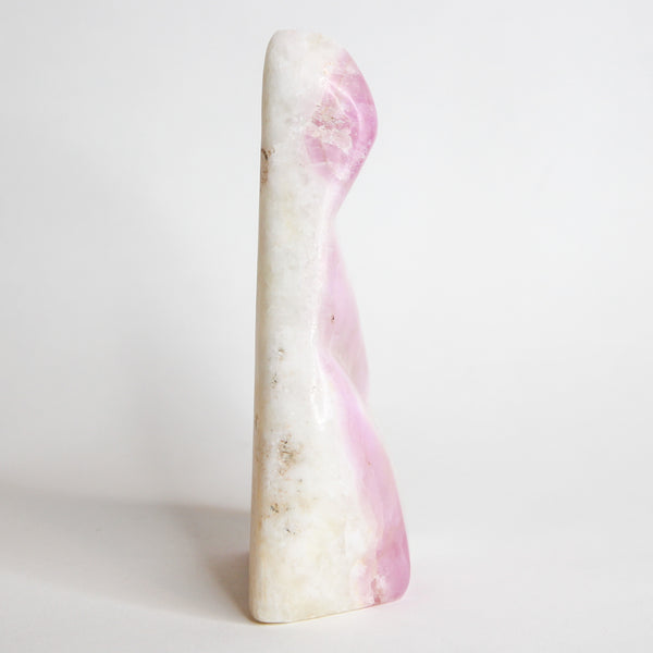 This freeform polished piece of pink aragonite is an organic triangular shape. The front holds the pink while the rest is white aragonite and calcite. There is a sweet little pink corner on the back (check out the video). There is also a little druzy pocket at the top, back of the crystal.